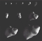 Kometen sind kleine, irregulär geformte Körper, die aus einer Mischung aus nicht flüchtigen Partikeln und gefrorenem Gas bestehen. Sie haben extrem elyptische Bahnen, die sie sehr nahe an die Sonne und dann wieder weit in den Weltraum führen, oft deutlich hinter die Bahn des Pluto . Der bekannteste Komet ist der oben links abgebildete Halley'sche Komet . Seine Umlaufzeit um die Sonne beträgt in unserem Jahrhundert etwa 76 Jahre. Durch das Ausgasen, aber mehr noch durch den Gravitationseinfluß der anderen Planeten ändert sich seine Umlaufzeit ständig. In den zurückliegenden Jahrhunderten nahm die Periode von ca. 79,3 auf die genannten 76 Jahre ab. Halley wurde im Jahr 1986 während seines letzten Perihel von der Sonde Giotto besucht. Der direkt neben Halley abgebildete Komet Hyakutake wurde vom Hubble Weltraumteleskop am 25. März 1996 aufgenommen. Rechts daneben ist der Komet Kohoutek abgebildet und rechts außen ist der Hale-Bopp wiedergegeben der das innere Sonnensystem im Jahr 1997 besucht hat. Die Struktur eines Kometen ist vielfältig und sehr dynamisch. Alle Kometen entwickeln eine Wolke aus diffusem Material den Koma, welcher in Größe und Helligkeit wächst, während sich der Komet der Sonne nähert. Üblicherweise ist ein heller Kern (weniger als 10 Kilometer im Durchmesser) in der Mitte des Koma sichtbar. Koma und Kern bilden den Kopf des Kometen. |