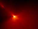 Wenn sich Kometen der Sonne nähern entwickeln sie einen ausgedehnten Schweif aus leuchtendem Material. Dieser dehnt sich über Millionen von Kilometern vom Kopf ausgehend in die sonnenabgewandte Richtung aus. Weit entfernt von der Sonne ist der Kern sehr kalt und das Material ist in gefrorenem festen Zustand. In diesem Zustand werden Kometen oft als "schmutziger Eisberg" oder "schmutziger Schneeball" bezeichnet, da mehr als die Hälfte ihres Kerns aus Wasser besteht. In Sonnennähe verdampfen die flüchtigen Bestandteile und reißen dabei kleine Staubpartikel mit sich, diese bilden dann den Kometenkoma aus Gas und Staub. Der Strahlungsdruck der Sonne und der Sonnenwind beschleunigen Partikel, ausgehend vom Kometenkopf, auf unterschiedliche Geschwindigkeiten. Partikel mit großer Masse, wie Staubteilchen, werden langsam beschleunigt. Der von ihnen gebildete Kometenschweif neigt dazu gekrümmt zu verlaufen. Anders dagegen der Ionenschweif eines Kometen. Dieser besteht, wie der Name schon sagt, aus leichten, ionisierten Bestandteilen. Diese werden stark beschleunigt, sodaß ein geradliniger Schweif, der direkt von der Sonne weg weist, entsteht. Bei einigen Kometen können diese beiden Schweife gut beobachtet werden. Kommt der Komet näher als eine Astronomische Einheit an die Sonne heran, so kann sich ein dritter Schweif ausbilden. Dieser dritte Schweif konnte schon bei Hyakutake beobachtet werden, aber am ausgeprägtesten war er bei Hale-Bopp. Die Spektralanalysen zeigten, daß es sich bei diesem dritten Schweif in der Hauptsache um Natrium handelt. Bei jedem Besuch der Sonne verliert ein Komet einen großen Teil seiner flüchtigen Bestandteile. Letzlich bleibt nur noch der feste Gesteinskern des Kometen übrig. Aus diesem Grund sind Kometen kurzlebige Objekte auf der kosmologischen Zeitskala. Wissenschaftler vermuten, daß einige Asteroiden ausgegaste Kometen sein könnten. |